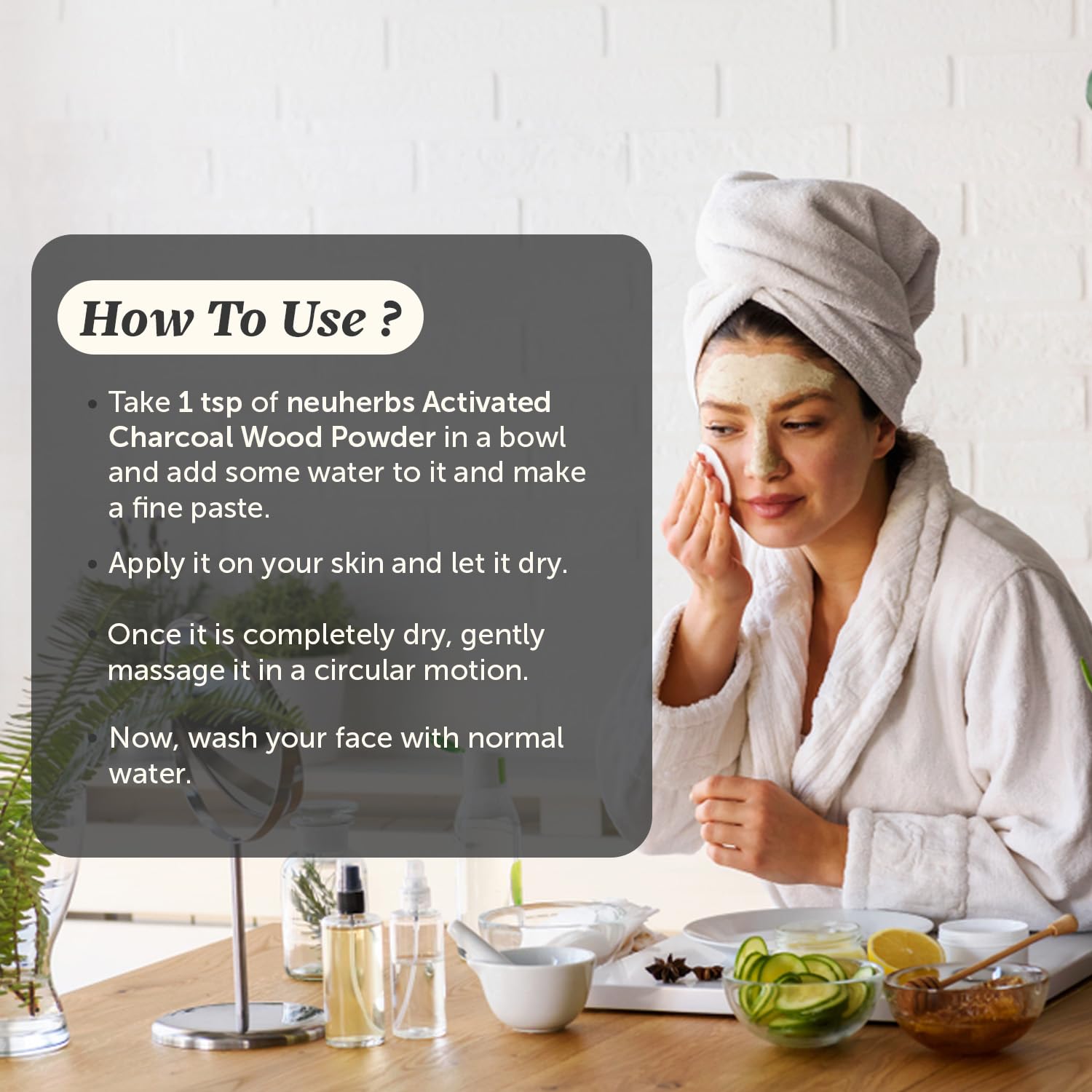 - How to Apply: Charcoal powder can be used as a face mask in different ways. Mix 1 teaspoon of neuherbs Charcoal Powder with water to form a paste. Apply it on face, let it dry & rinse off with cold water.