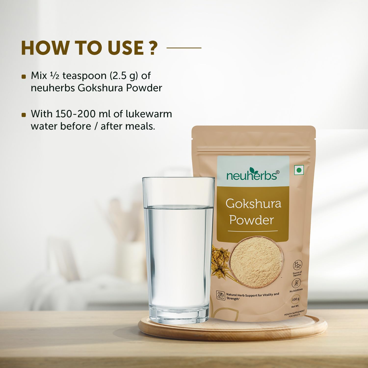Mix 1/2 teaspoon (2.5g) of neuherbs Gokshura Powder with 150-200 ml of lukewarm water before/after meals or directed by a healthcare professional.