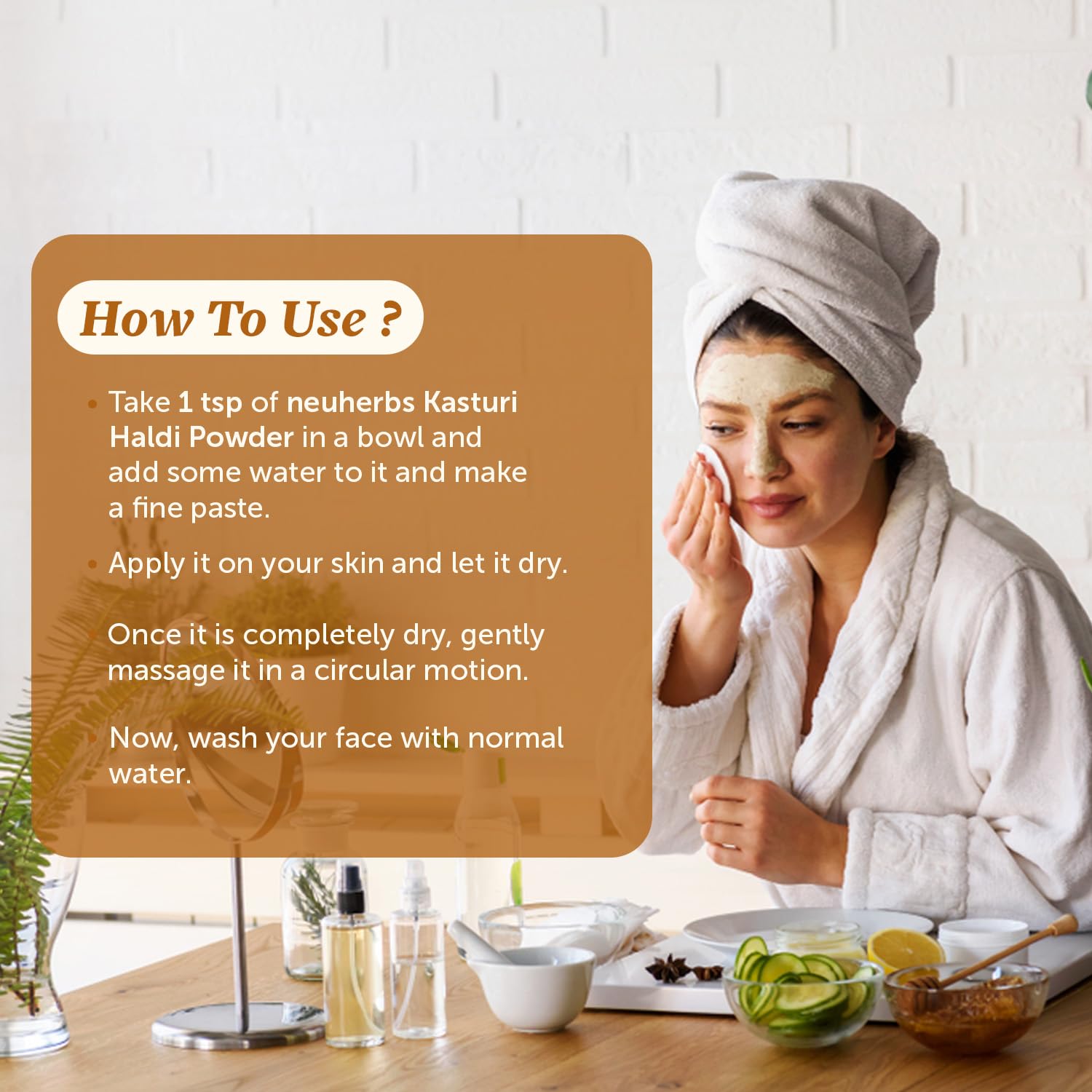 - Natural & Pure Haldi Powder: neuherbs Kasturi Haldi Powder for face pack is 100% natural and pure, sourced from wild turmeric, help fight signs of skin maturing, when applied on skin