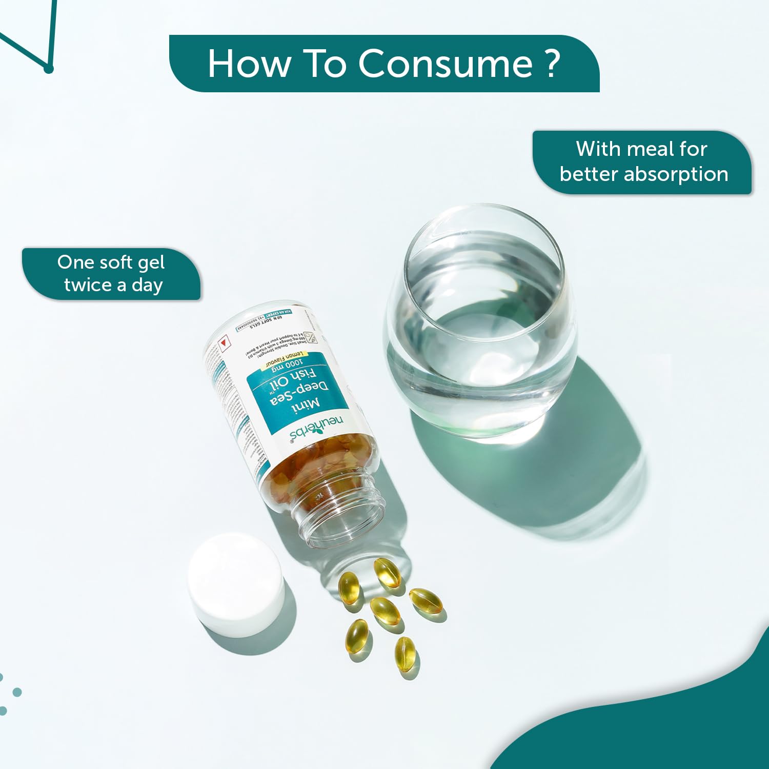 Neuherbs Mini Deep Sea Omega 3 Fish Oil Capsules 1000mg Supplement | EPA - 360mg, DHA - 240mg | With Vitamin E & D3 | Suppots Heart, Brain, Muscle & Joint Health| Lemon Flavour - 120 Softgels