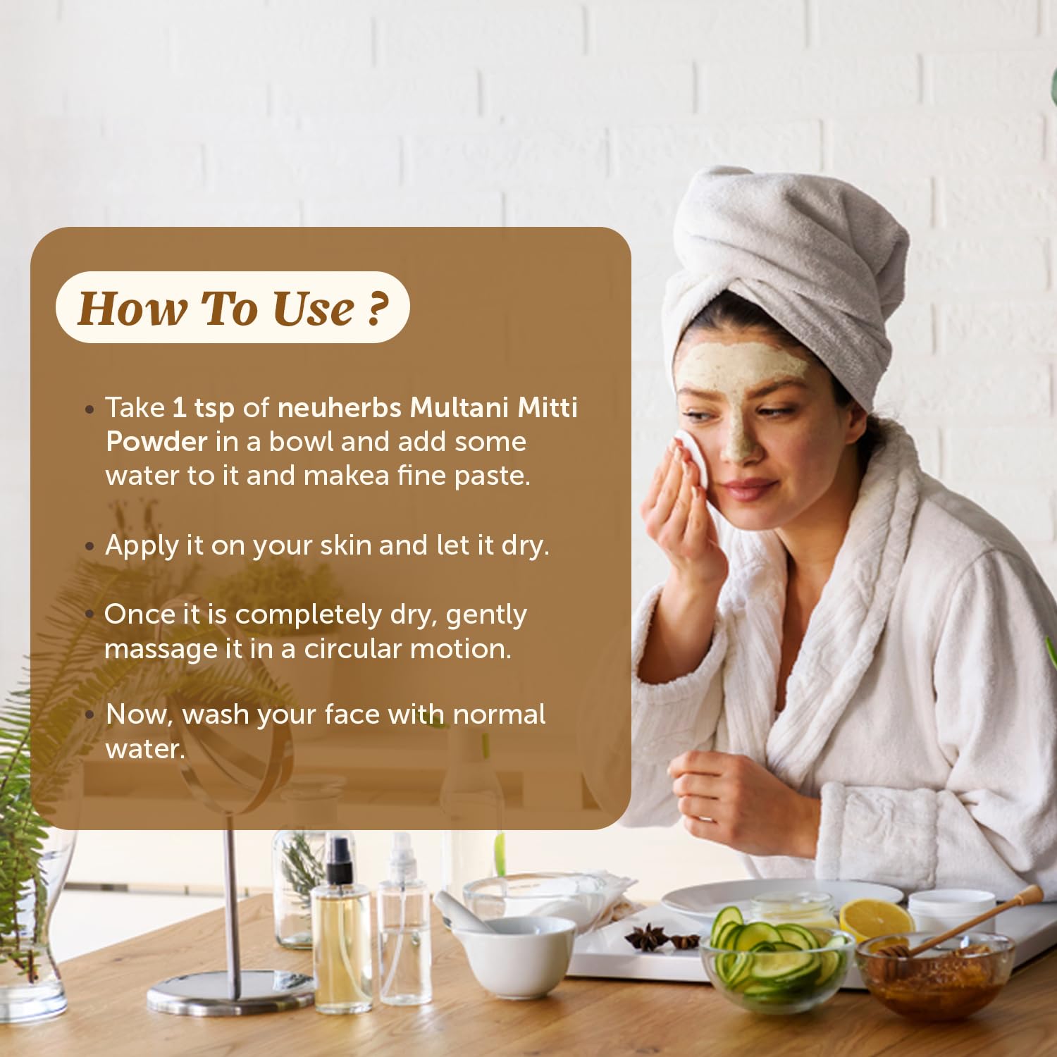 - 100% Natural Multani Mitti Powder: neuherbs Multani Mitti Powder is made from multani mitti obtained from natural sources to be the perfect Ayurveda support for your skin that helps in exfoliation.