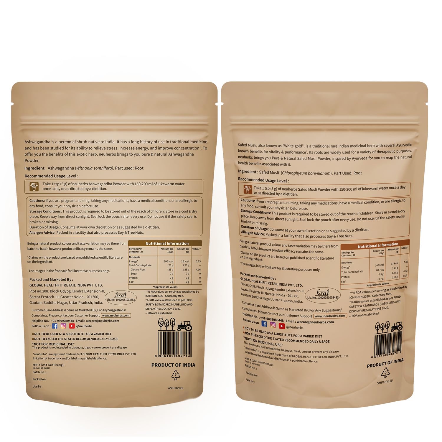 Neuherbs Organic Safed Musli + Ashwagandha Powder (200g) | Herbal Combo For Strength & Stamina Booster, Support for Stress, Mental Calmness & Anxiety Issues