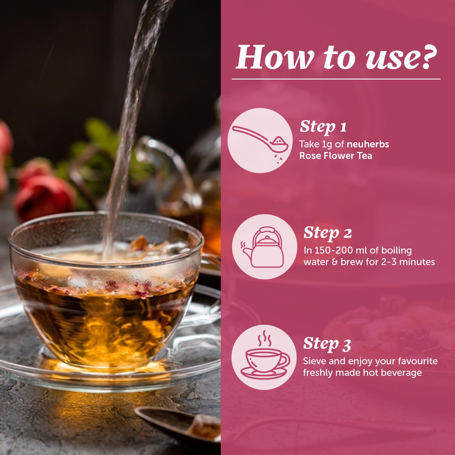 Add 1 g approx. of neuherbs Rose Flower Tea in 1 cup (150 ml-200 ml or as per your taste) of boiling water. Brew it for 2-3 min to infuse its taste and aroma in water. Sieve and enjoy your favorite freshly made hot beverage. Add teaspoon of honey to enhance the taste (optional), or use as suggested by your healthcar professional.