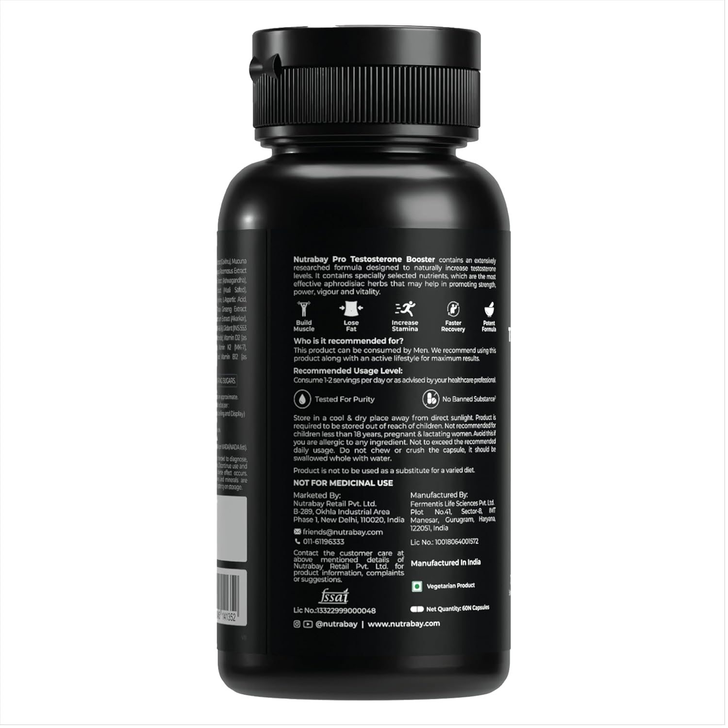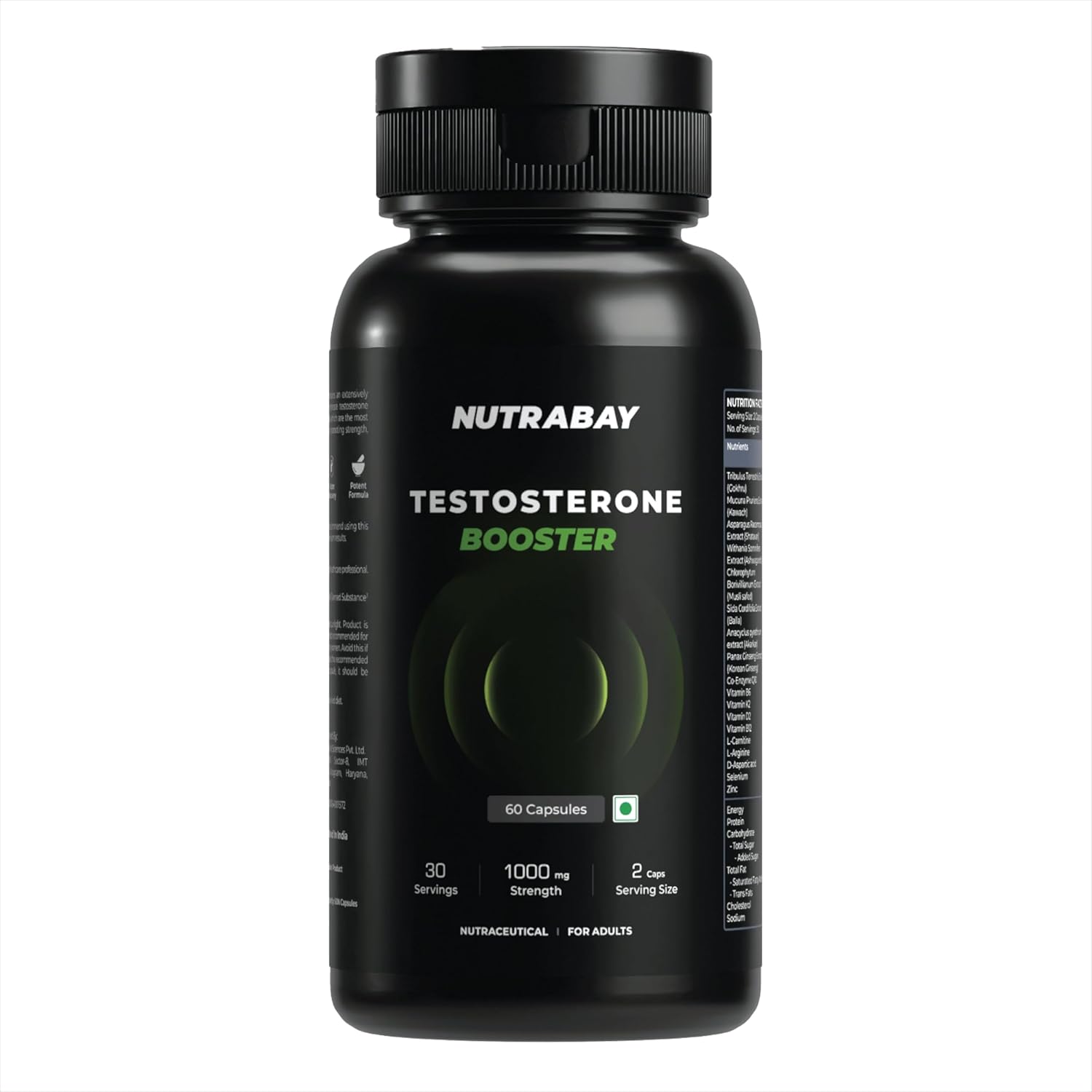• Nutrabay Pro Testosterone booster helps maintain testosterone levels required to boost Muscle, Stamina, Strength, Muscle Performance, Endurance, and Supports overall Wellbeing