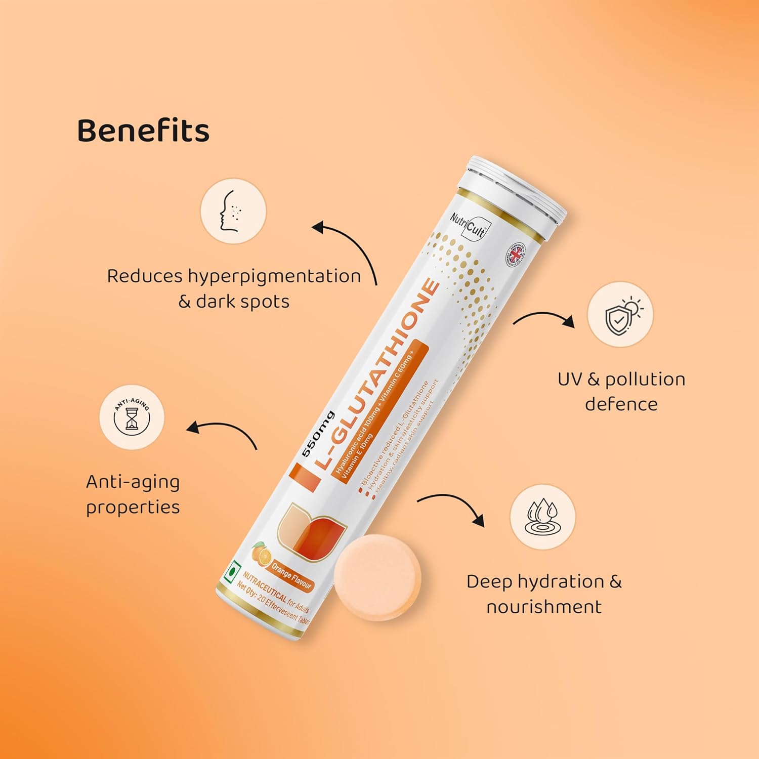 Nutricult L-Glutathione 550mg - 20 Effervescent Tablets Glutathione Effervescent Tablets for Glowing Skin with Hyaluronic Acid Vitamin C & Vitamin E | Skin Glow Supplement For Clear Skin | Orange