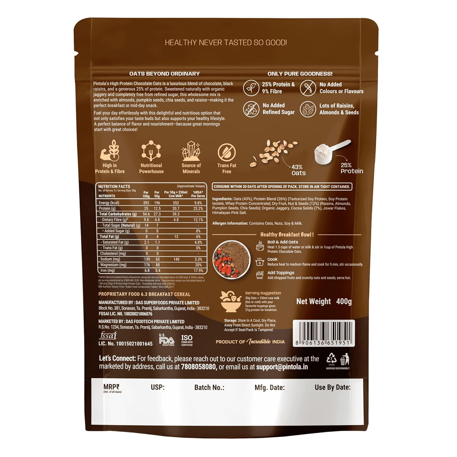 PINTOLA 25g High Protein Oats 400g, Dark Chocolate,No Refined Sugar, with Almonds Raisin, Pumpkin and Chia Seeds, 8g Fibre, Rolled Oats for weight loss, Breakfast Cereals | Gluten Free