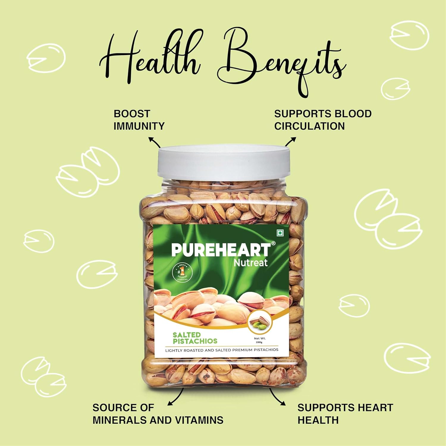 - Great Taste: Pureheart Nutreat Salted Pistachios nuts are a natural and premium snack option that is lightly roasted. The light roasting process captures the nut's essence, resulting in a well-balanced and delicious taste. It is a delicious snack perfect for parties and get-togethers at home.