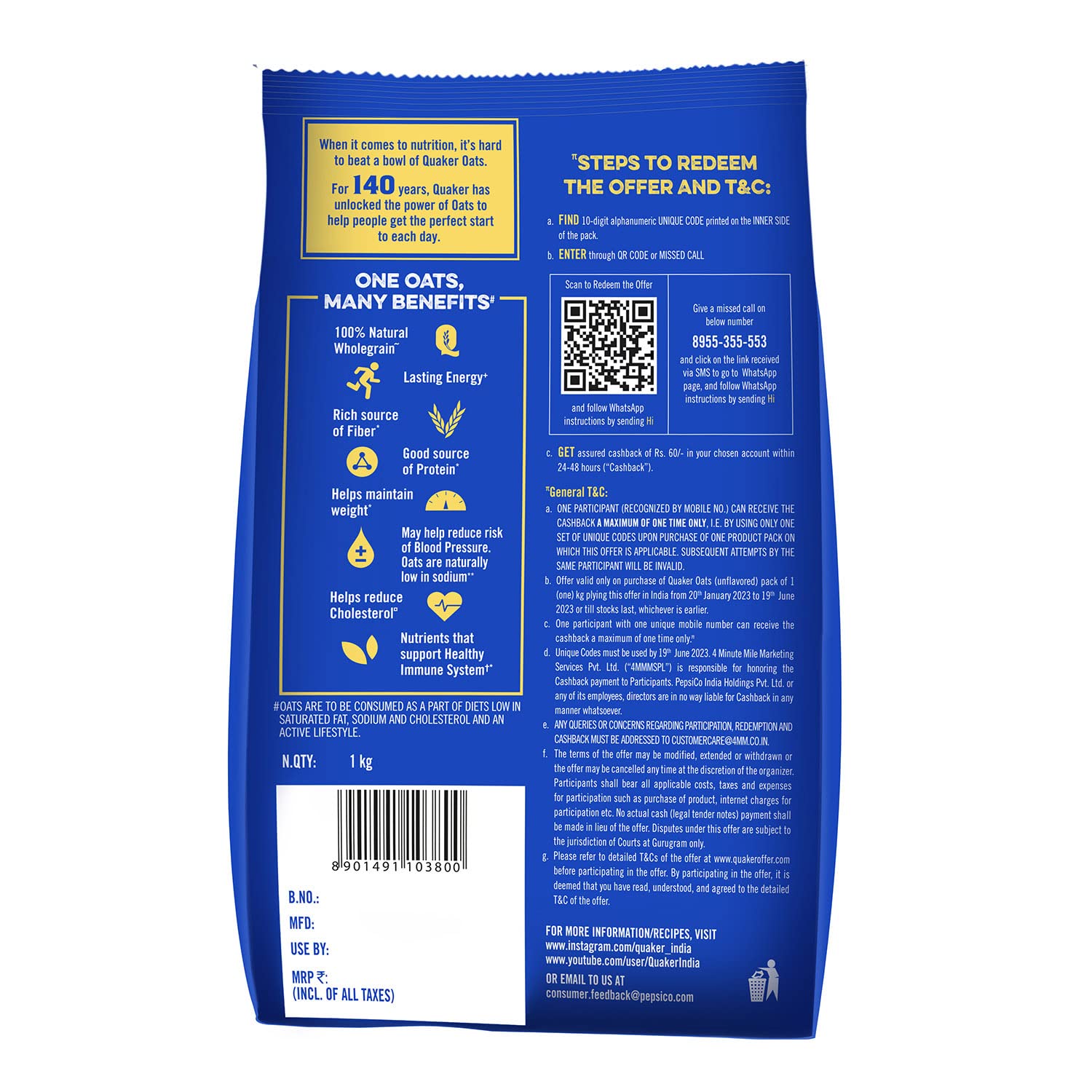 - RICH IN FIBRE and a good SOURCE OF PROTEIN; LASTING ENERGY: Start your day with a bowl of nutritious Quaker Oats, 100% Natural Wholegrain Oats contain complex carbohydrates that break down slowly to provide lasting energy