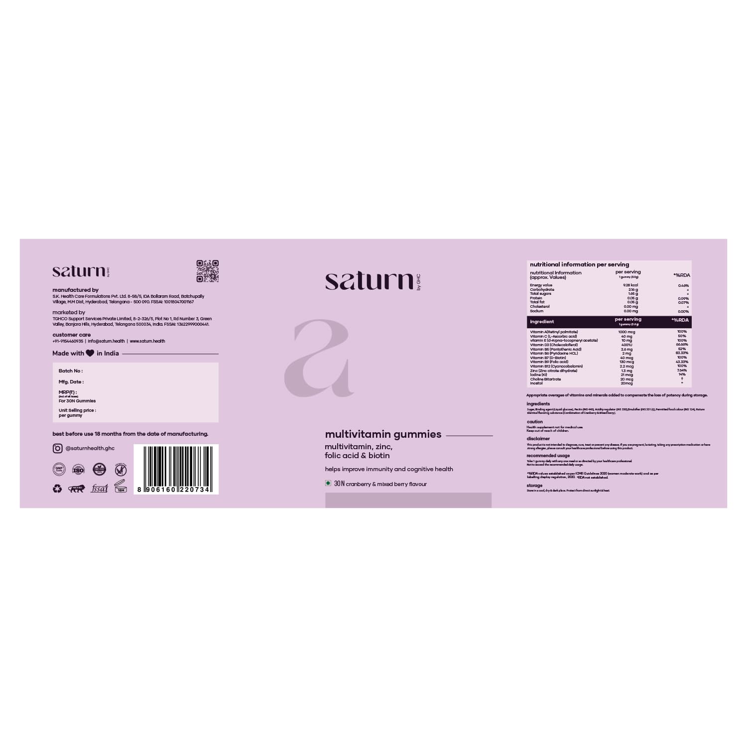 - Benefits of Saturn by GHC Multivitamin Gummies: Saturn by GHC Multivitamin Gummies can help you keep your skin & hair in tip-top shape! It is enriched with highly potent ingredients like biotin, zinc, multivitamin & folic acid.