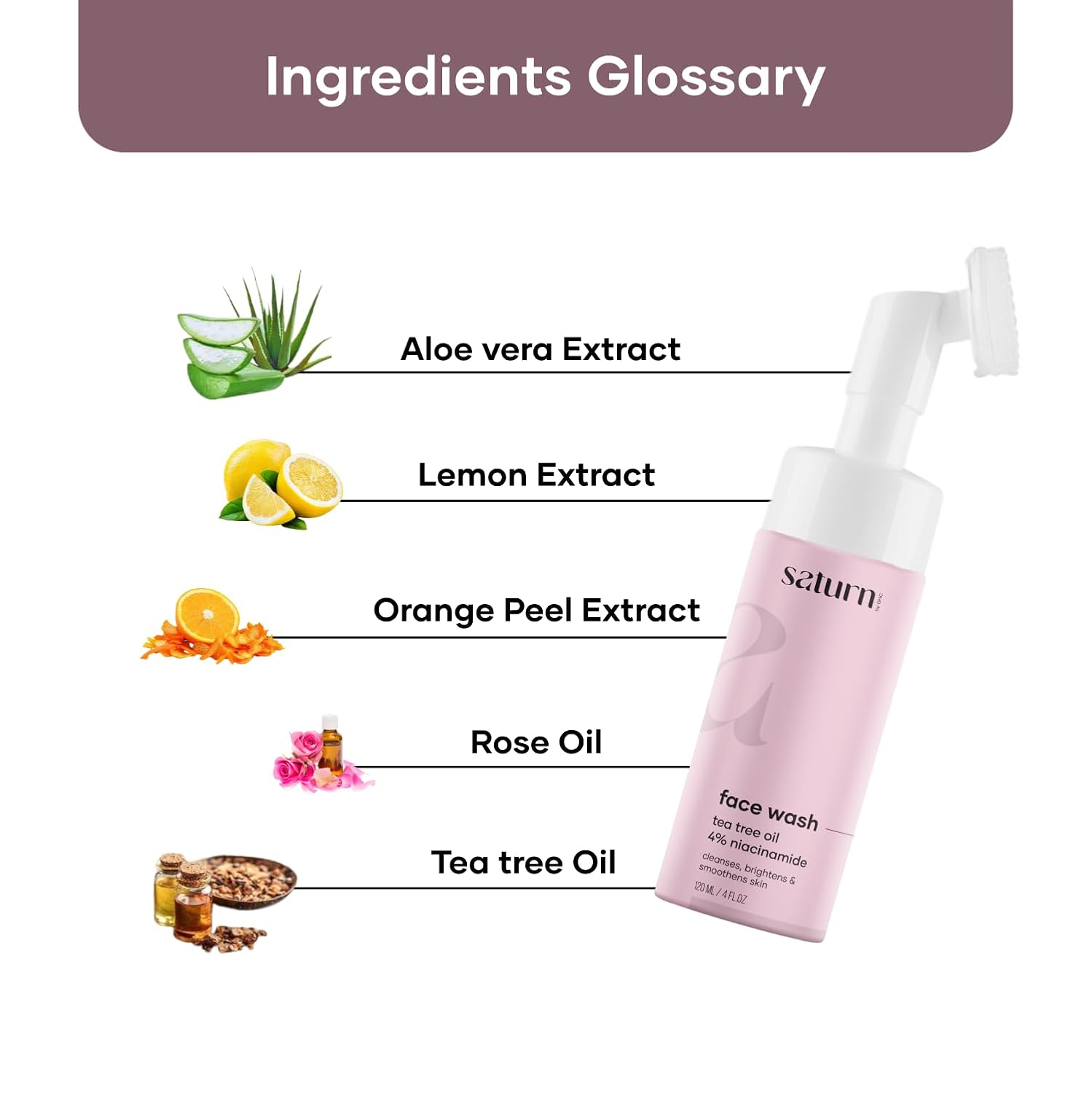 - Ingredients: Aloe Vera, Tea Tree Oil, Orange Peel Extract, Niacinamide, Rose Extract. Foaming Face Wash effortlessly reaches deep within the pores with the help of its soft built-in brush to clear out excess oil without disturbing your skin’s natural moisture barrier.