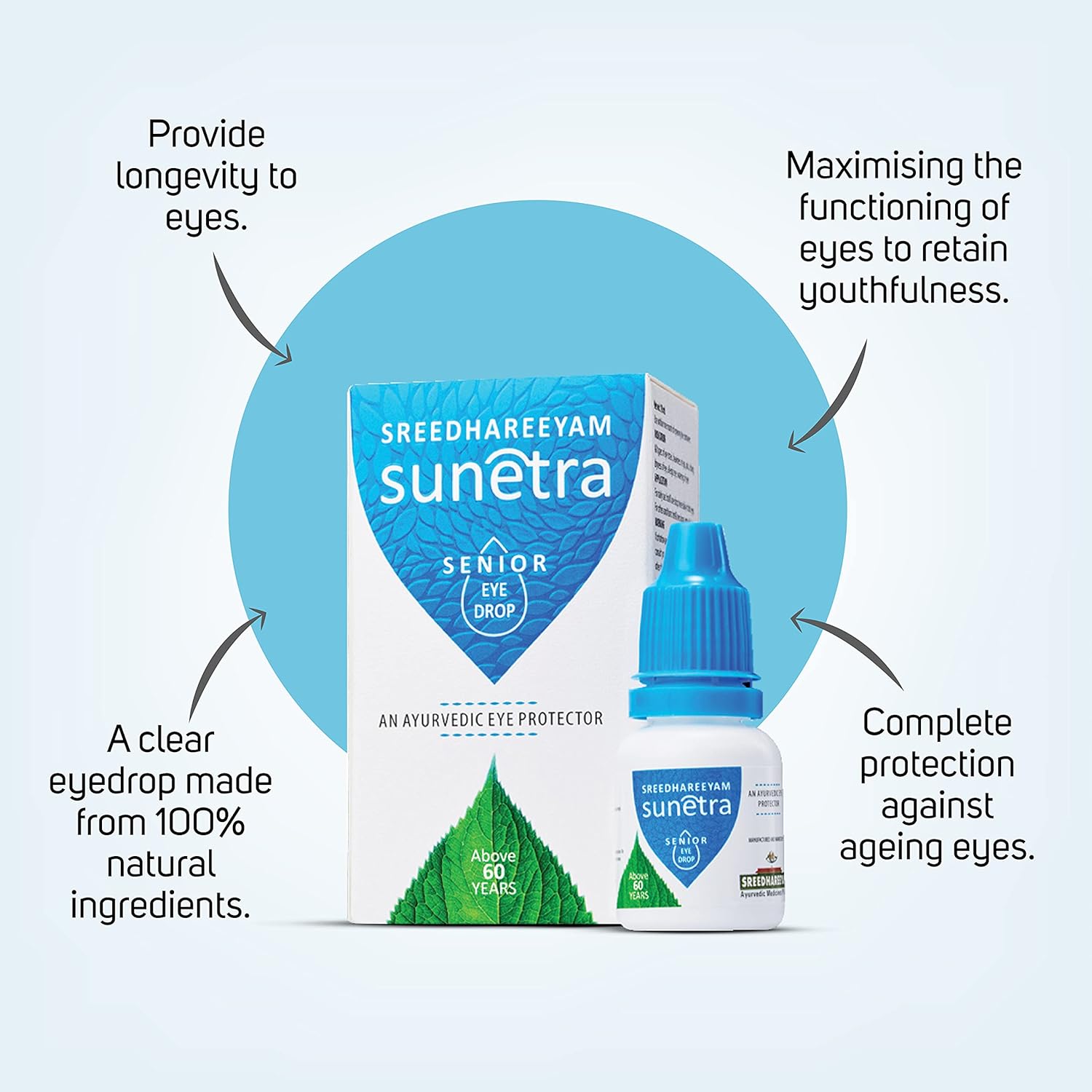 Sunetra Senior uses the proven Ayurvedic formula to protect your eyes and stalls their ageing by making them sharp and fresh. Regularly using the eye drop can reduce dryness, clears allergies and increases the longevity of your eyes, which usually diminishes during old age. The eyedrop uses ingredients like Sappan wood, Clearing nut, Harithaki, Vibhithaki, Liquorice, Jati, Padmakam, Borneol and Honey to make a one of a kind product that helps you protect your eyes.