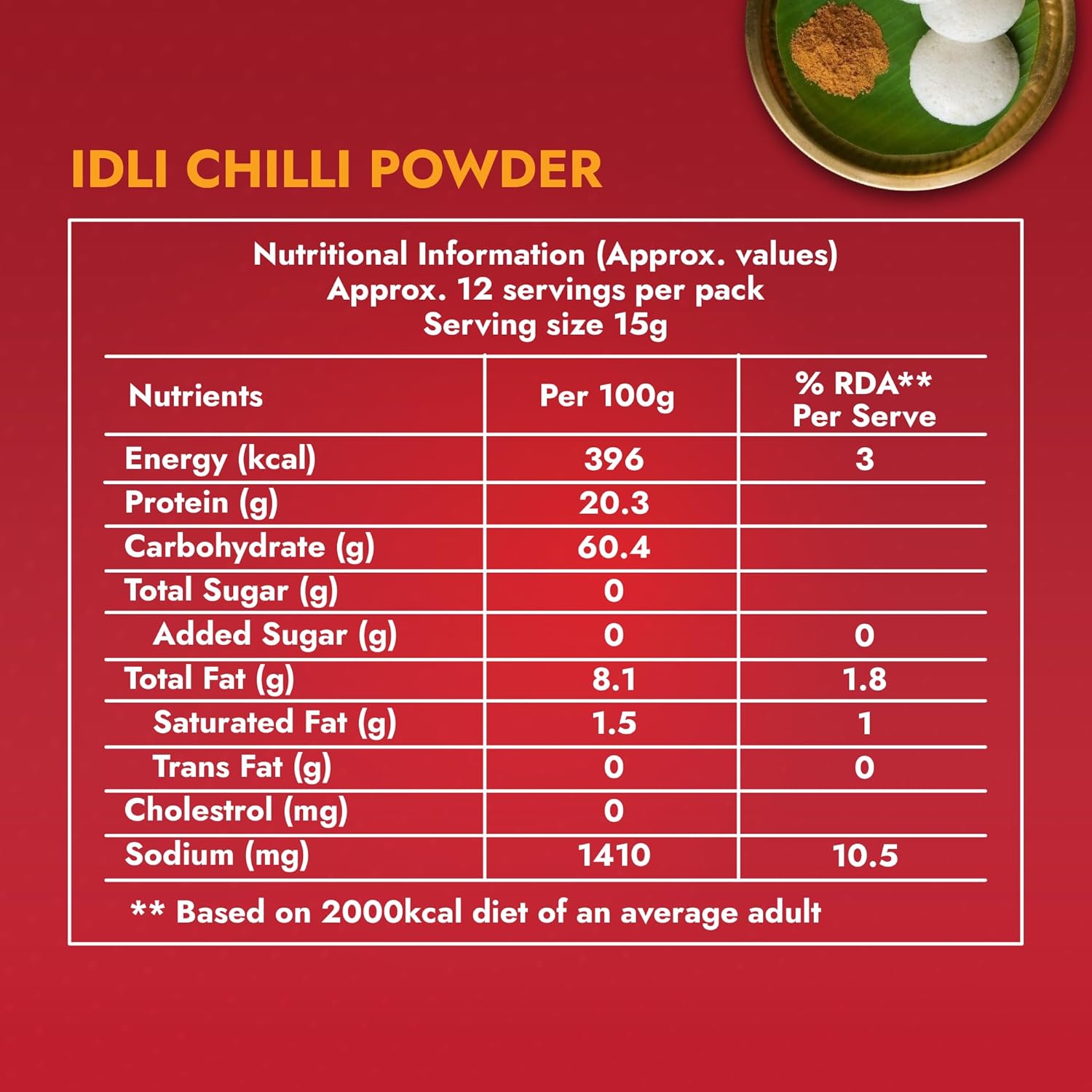 Add a bold South Indian touch to your meals with our Authentic Idli Podi! This spicy chili "gunpowder" is made with premium ingredients like urad dal, Bengal gram, red chili, sesame, and asafoetida—no preservatives, additives, onion, or garlic. Mixed with oil, it releases an irresistible aroma and is the perfect complement to idlis, dosas, and uttapams. Sprinkle on any savory dish for a burst of flavor.