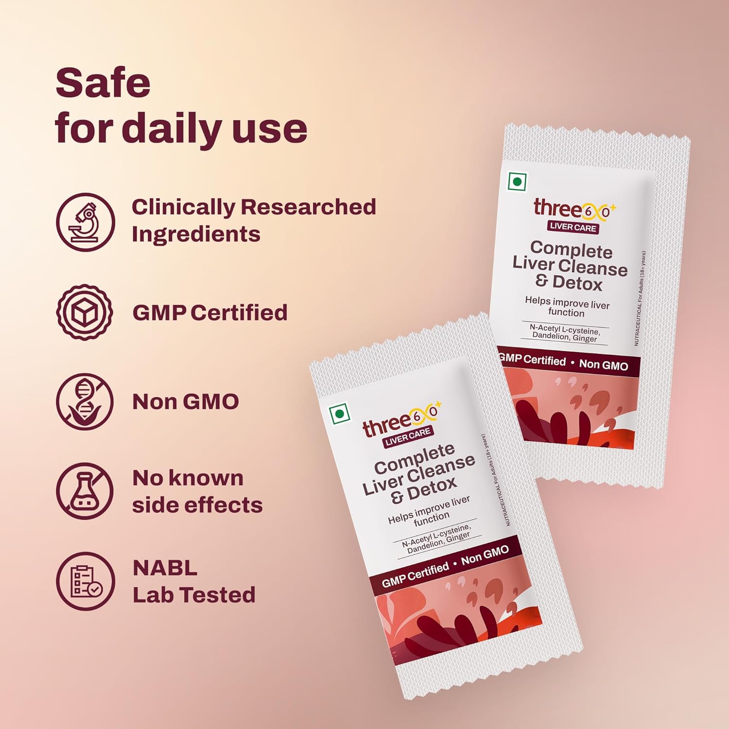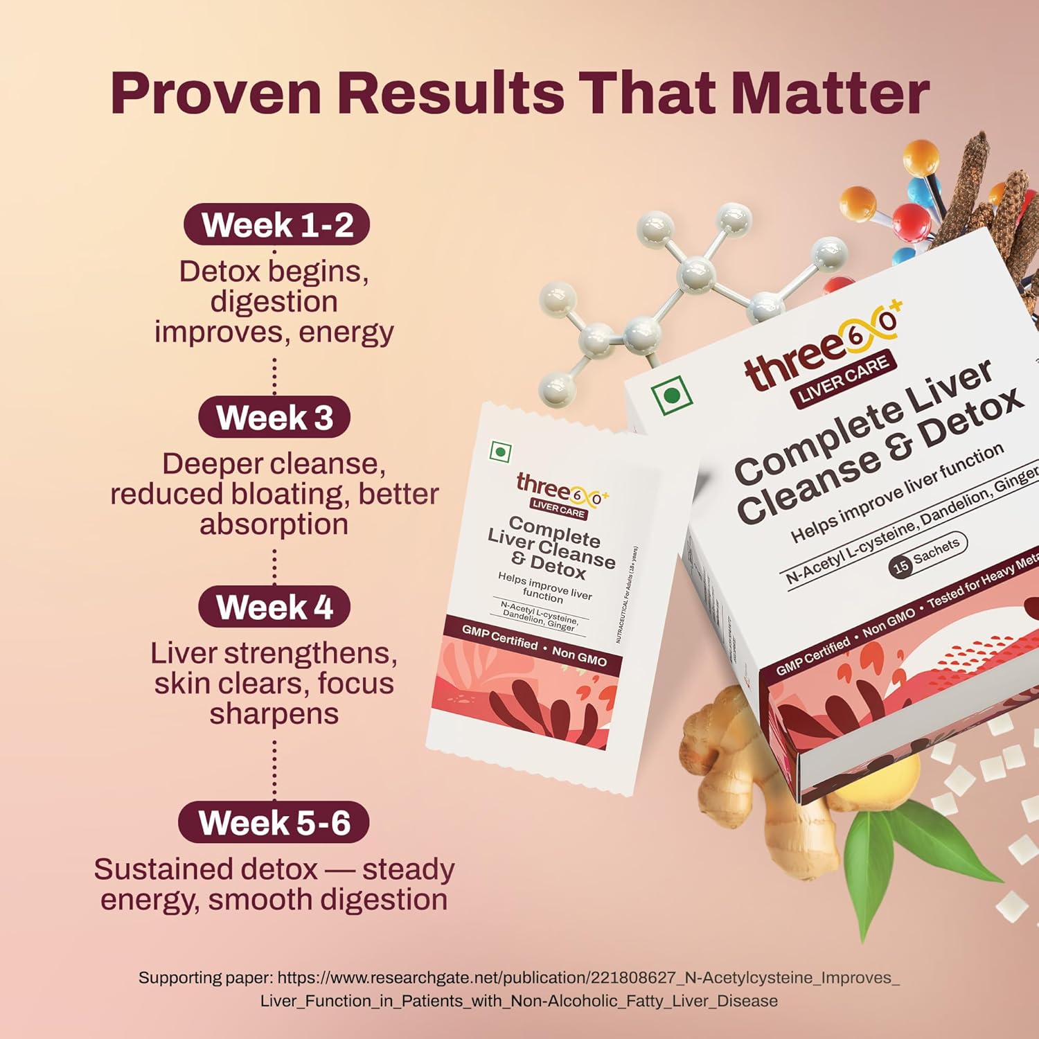 Daily Liver Detox You Can Count On Your liver filters toxins every single day - so why not support it daily? three60+ Complete Liver Cleanse & Detox is your go-to daily liver detox supplement, crafted with clinically backed ingredients to gently cleanse your liver, flush out toxins, and promote better digestion, metabolism, and skin clarity. Each sachet delivers a therapeutic dose of NAC (N-Acetyl Cysteine), Alpha Lipoic Acid, Dandelion Leaf Extract, and Ginger Rhizome Extract, helping your liver do what it does best — detoxify. With daily use, it supports a gradual reduction in elevated liver enzymes (SGPT, SGOT), enhances bile flow, and relieves signs of toxin overload like bloating, fatigue, and dull skin. Formulated for everyday wellness, it’s non-GMO, clinically tested, and safe for long-term use. Whether you’re exposed to stress, alcohol, processed foods, or pollution - this is your daily ritual for a lighter, cleaner, and stronger you.