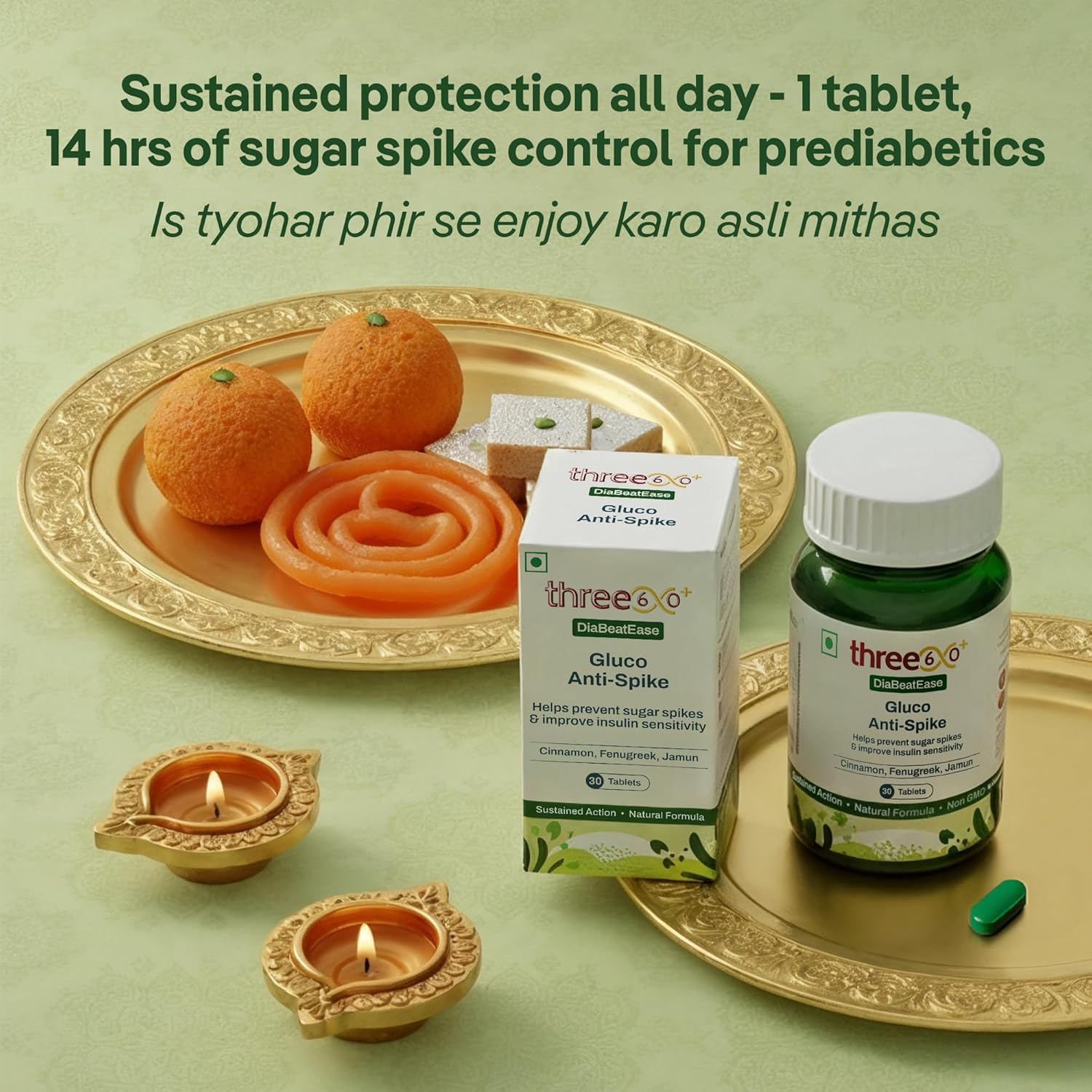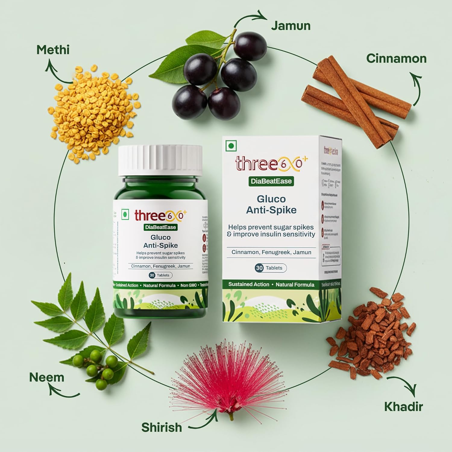 three60+ Gluco Anti-Spike Tablets | Sugar Control Tablet for Prediabetics | 14-Hour Sustained Release | Clinically Proven Diabetic Care Tablets & Supplements | Natural, Gluten Free, Non-GMO | 30 Tablets