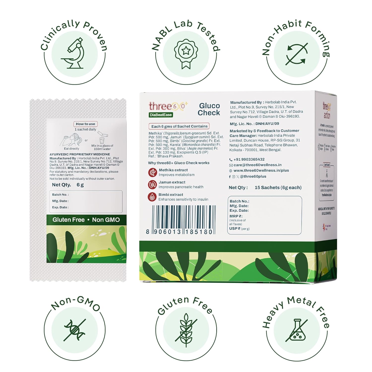 three60+ Gluco Check Powder | Diabetic Care & Diabetes Control Powder | Clinically Proven Diabetic Supplement for Blood Sugar Level | Better than Juice with Only Jamun, Karela | Natural, Non-GMO, Gluten Free | 15 Sachets | 15 Day Pack (Pack of 1)