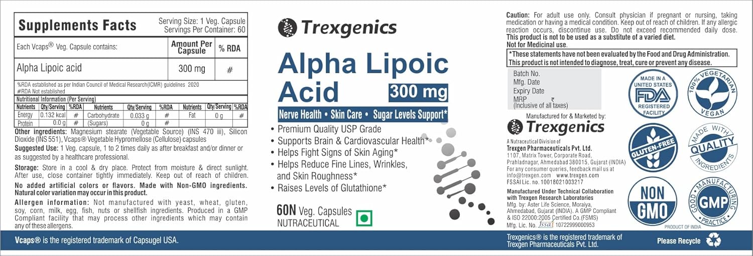 Trexgenics Alpha Lipoic Acid 300 mg is a premium quality USP grade that is ideal to support Glucose Metabolism, Liver Health, Skin Care & Brain Health. Trexgenics utilizes USP grade Alpha Lipoic acid to ensure efficacy and potency.