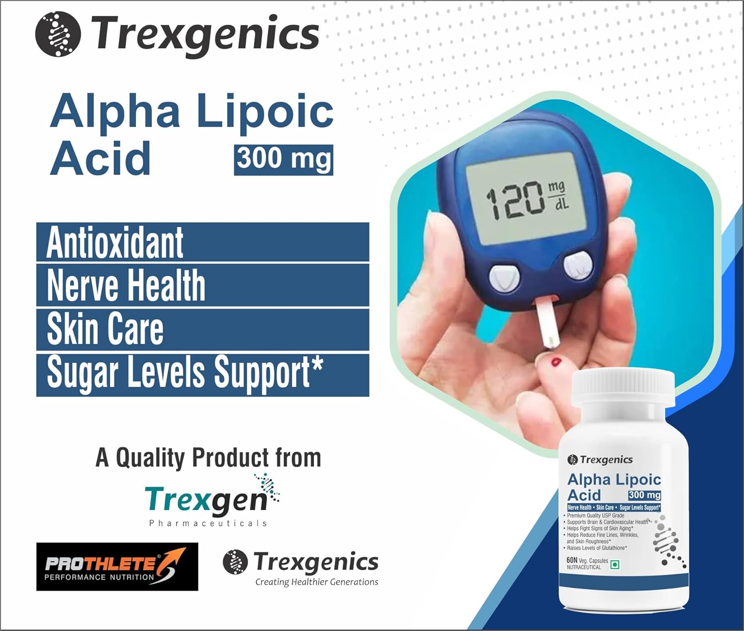 - Trexgenics Alpha Lipoic Acid 300 mg is a premium quality USP grade that is ideal to support Glucose Metabolism, Liver Health, Skin Care & Brain Health. Trexgenics utilizes USP grade Alpha Lipoic acid to ensure efficacy and potency.