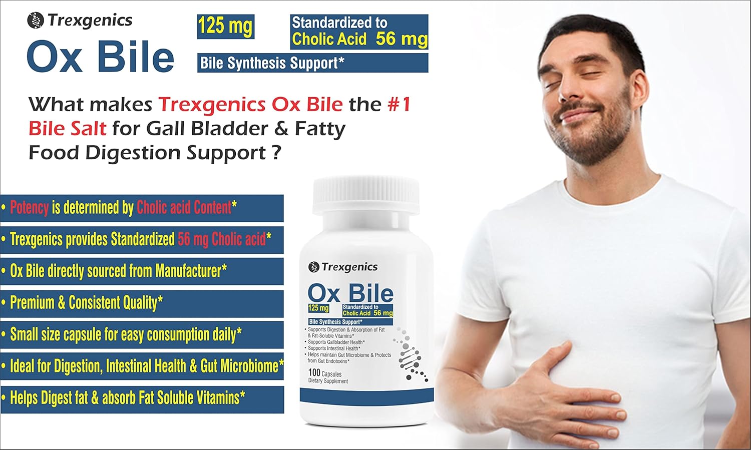 Trexgenics BILE EXTRACT 125 mg 45% CHOLIC ACID Bile Synthesis Support (100 Capsules) (Pack of 1).