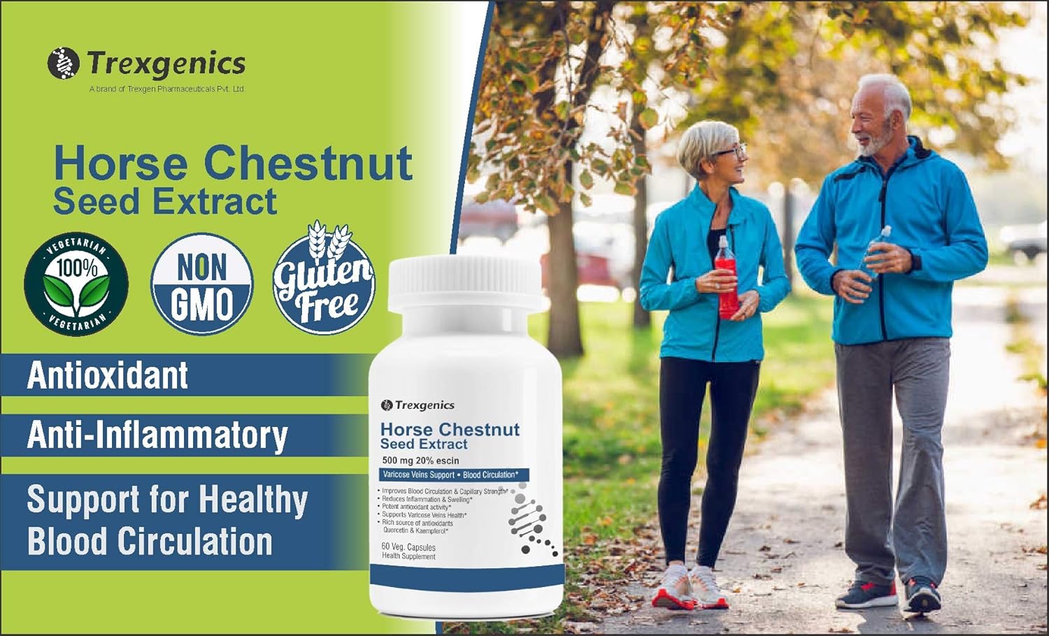 - ✓Trexgenics Horse Chestnut extract is premium quality Blood Circulation & Leg Vein Support standardized to 20% aescin, the key component responsible for improving Capillary strength, Blood Circulation & Antioxidant activity. Horse Chestnut has potent anti-inflammatory activity . Horse Chestnut promotes capillary strength and Vein Health.