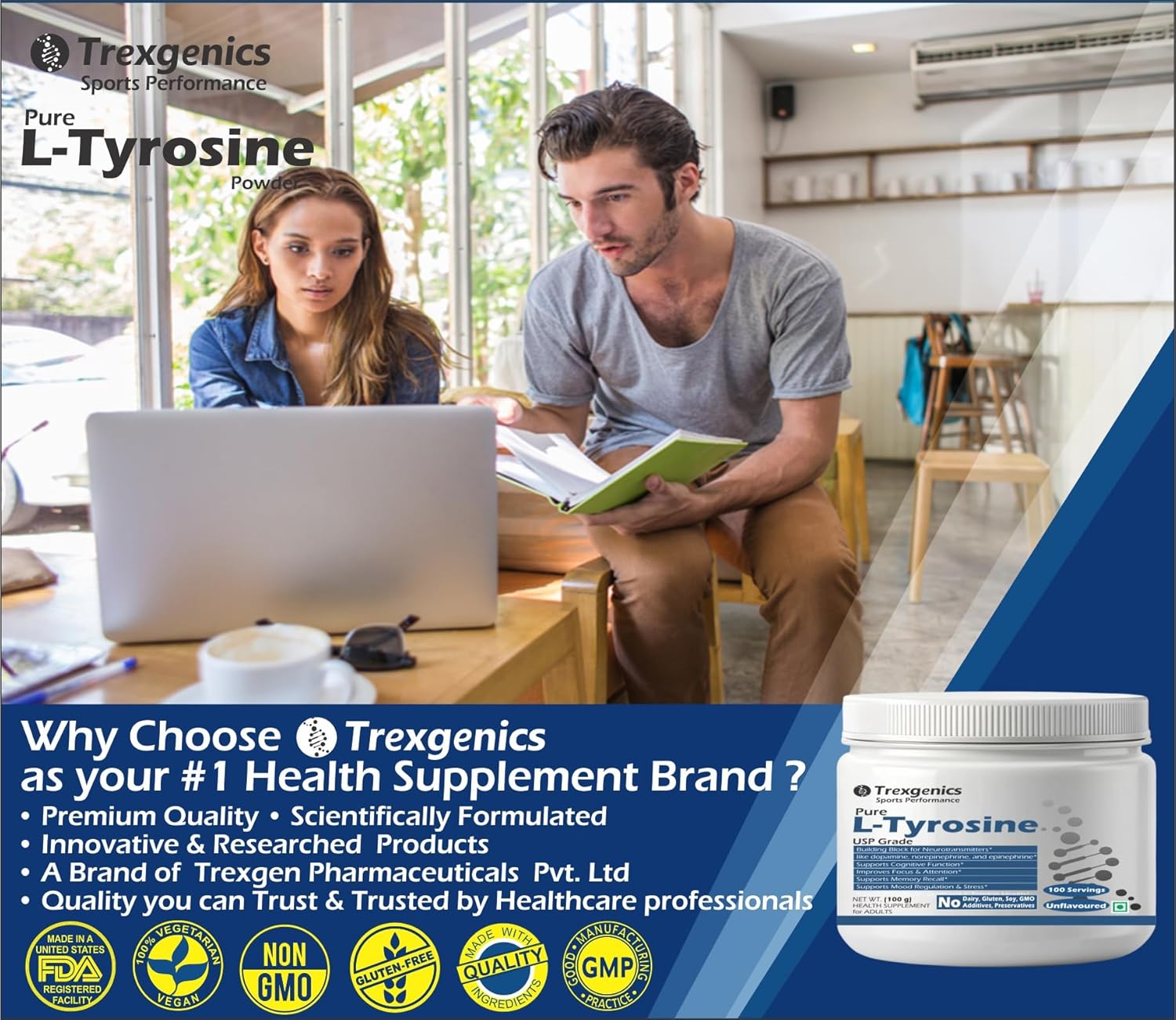 Trexgenics L-TYROSINE PURE POWDER USP grade Neurotransmitter production, Cognitive Function, Focus, Attention, Memory, Stress Support (100 gram)