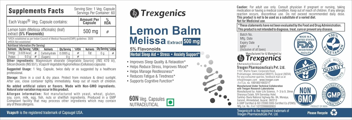 - Trexgenics Lemon balm 500 mg 5% Flavonoids plays a role in optimizing immune health, digestive health and providing a sense of balance for the nervous system.