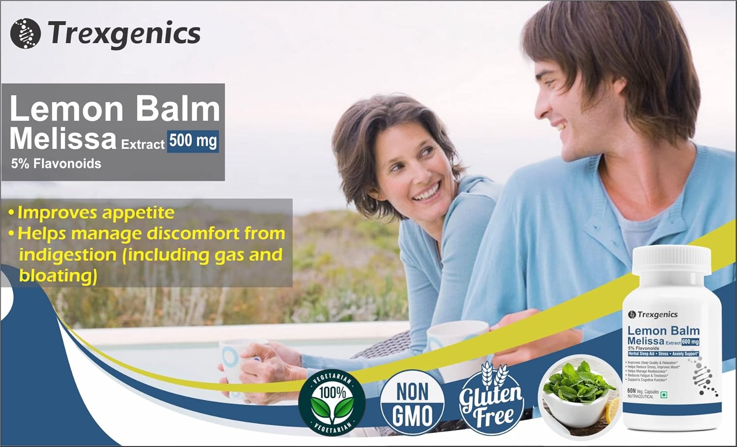 Trexgenics LEMON BALM 5% Flavonoids 500 mg Sleep, Relaxation, Mood Support VEGAN & NON-GMO (60 Veg. Capsules) (Pack of 1)