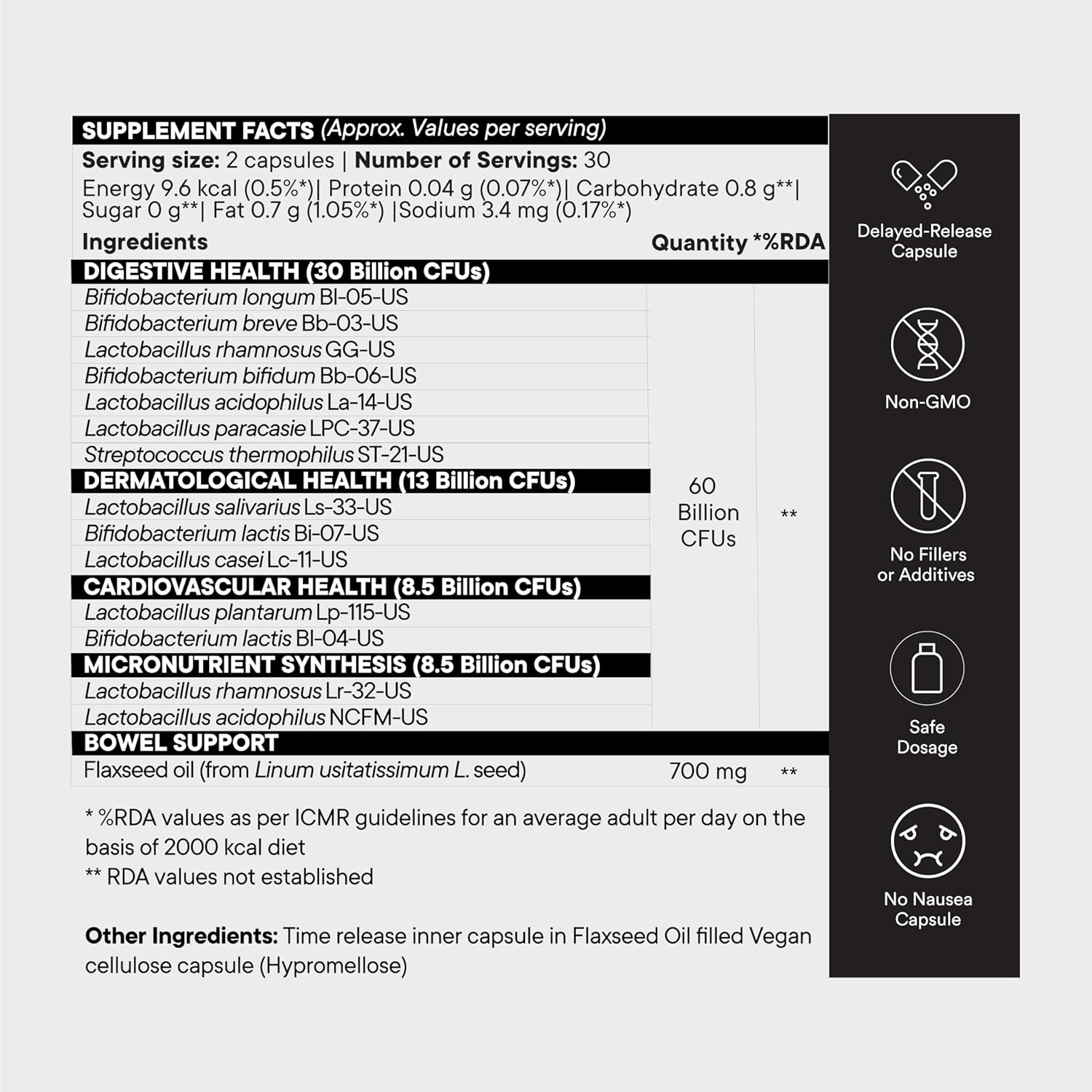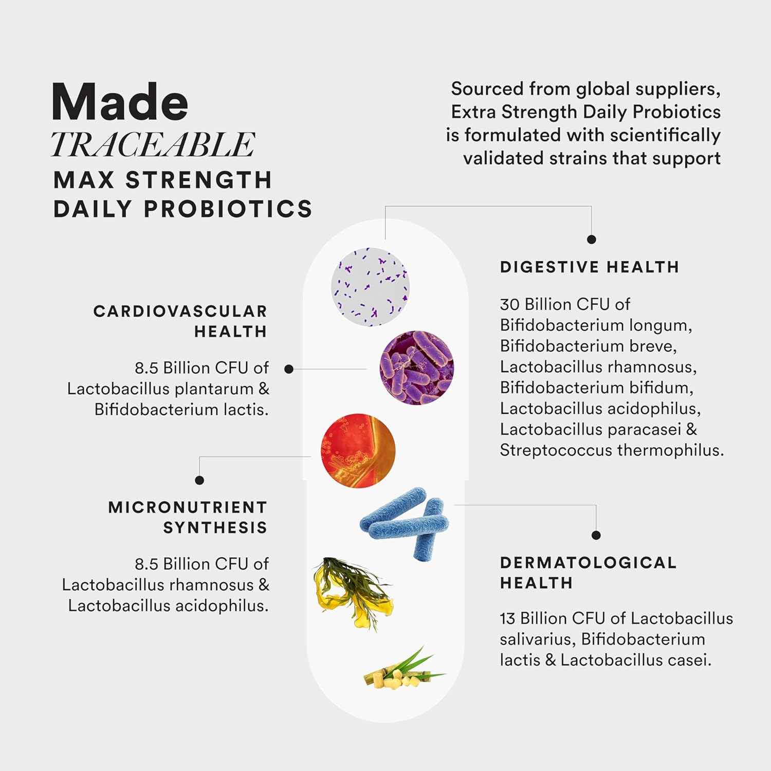 Digestive Health (30 Billion CFU): Bifidobacterium longum, Bifidobacterium breve, Lactobacillus rhamnosus, Bifidobacterium bifidum, Lactobacillus acidophilus, Lactobacillus paracasei, Streptococcus thermophilus | Dermatological Health (13 Billion CFU): Lactobacillus salivarius, Bifidobacterium lactis, Lactobacillus casei | Cardiovascular Health (8.5 Billion CFU): Lactobacillus plantarum, Bifidobacterium lactis | Micronutrient Synthesis (8.5 Billion CFU): Lactobacillus rhamnosus, Lactobacillus acidophilus