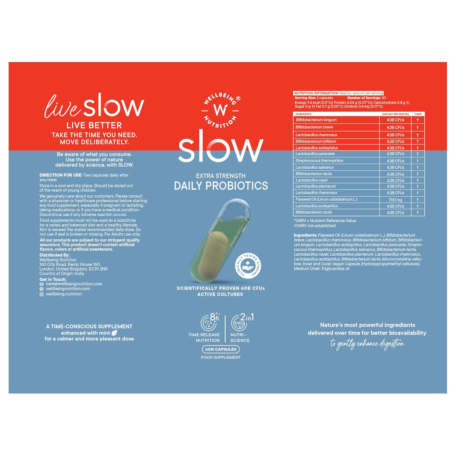 - WORLD'S ONLY PROBIOTIC + OMEGA-3 CAPSULE: Formulated by noted German Gastroenterologist Dr. Rainer Duchmann, SLOW Extra Strength Daily Probiotics is the World's only probiotic+Omega 3 supplement that incorporates strains exerting many systemic benefits extending beyond the gut. The capsules are made using a revolutionary microcapsule-in-oil technology with 8-hour timed-release probiotic inner microcapsules suspended in omega-3-rich flax seed oil for complete gut health.