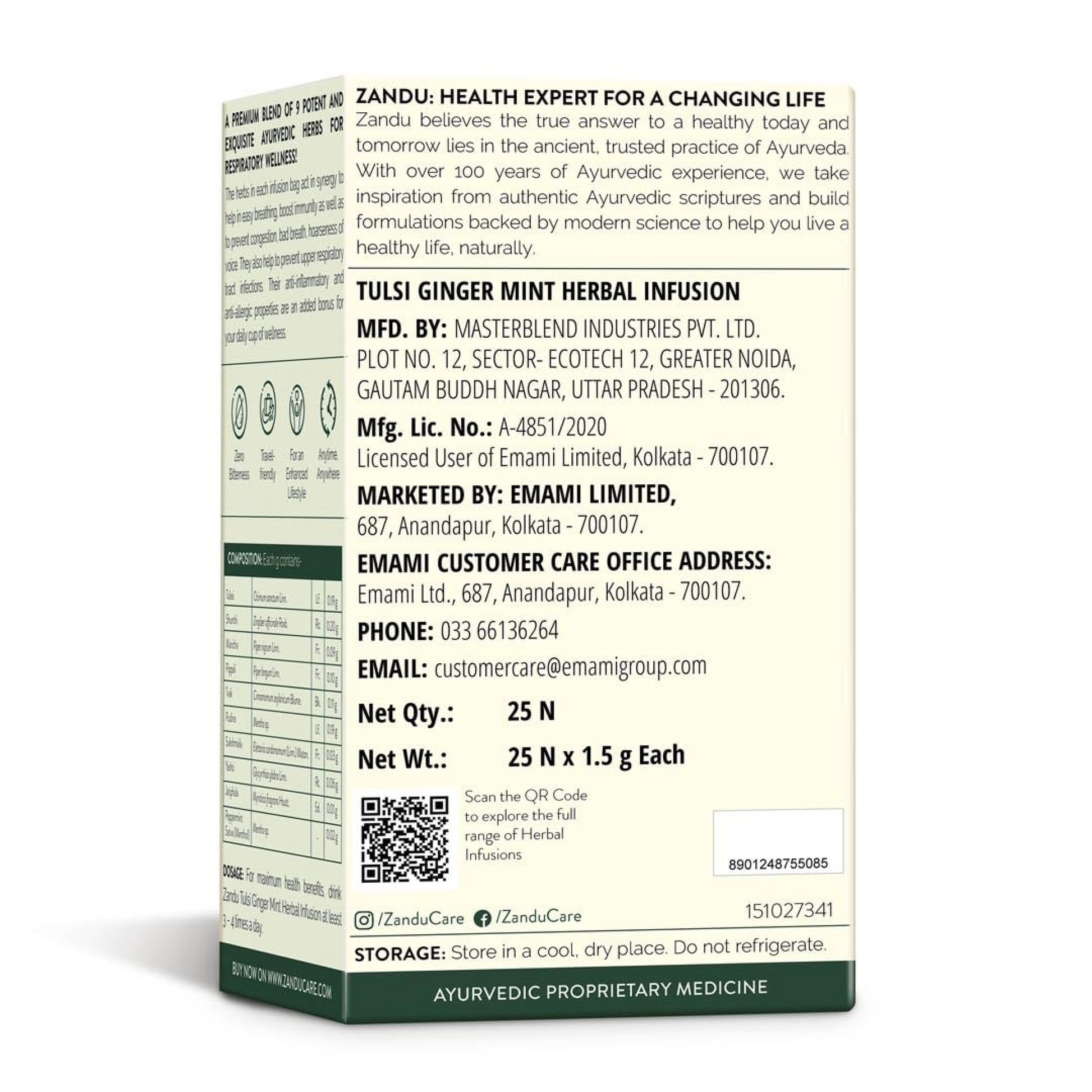- Supports respiratory health: Zandu Tulsi Ginger Mint Ayurvedic Infusion contains Ayurvedic ingredients like Tulsi & ginger that help in respiratory health and wellness.